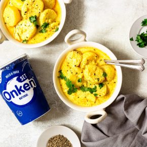 Potatoes simmered in a garlicy-yogurt-y sauce