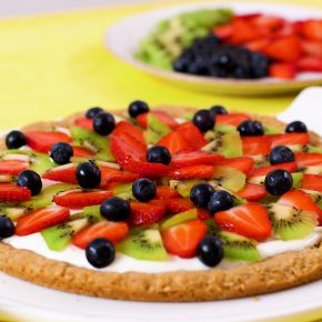 Cookie base with cream cheese icing and fresh fruit.
