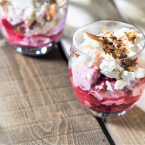 Scrumptious strawberry yogurt with crushed meringue, almonds